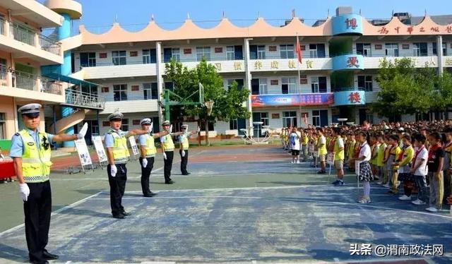 “9月3日上午,大荔县公安局交通管理大队组织民警走进仁厚里小学,通过举办讲座、图片展出、讲解法规和交通指挥手势表演,为小学生上好新学期交通安全第一课。