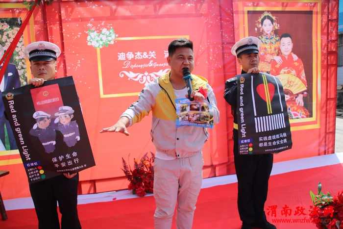 当天上午,得知孟塬镇迪家一村民在自家举办婚礼,中队宣传民警立即前往,与婚礼司仪协商交通安全宣传事宜。经过简短培训,司仪与民警密切配合,同台宣传普法,司仪将交通法规与群众出行相结合,通行规则与事故案例相结合,严肃的交通法规通过司仪妙语连珠的精彩讲解,赢得现场宾朋阵阵喝彩,为婚礼现场增添了一道亮点。此时,民警紧抓时机,向现场来宾讲解了酒驾、超速、疲劳驾驶等严重交通违法行为的危害,呼吁广大群众关注交通安全,遵守交通法规,安全文明出行。最后民警为在场来宾赠送了印制有交通安全知识的围裙、购物袋等实用小礼品,深受全场宾朋欢喜。