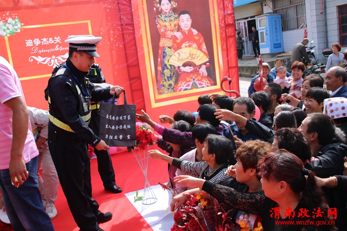 渭南政法网(通讯员 张峰)9月16日,华阴市孟塬镇迪家一村民婚礼现场迎来了一群特殊的“客人”——华阴交警大队华山中队民警,为新人送上一份“平安贺礼”。