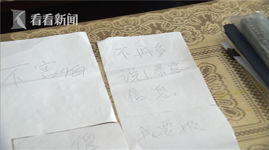 当时,王阿姨在拨打了110报警电话以后,看到儿子仍然在跟对方通话,而且打的还是视频电话。那为了不引起对方的怀疑,同时也防止儿子上当受骗,王阿姨便把这样一张张写着警示标语的小纸条,悄悄地递到了儿子的面前,用来给儿子提个醒。
