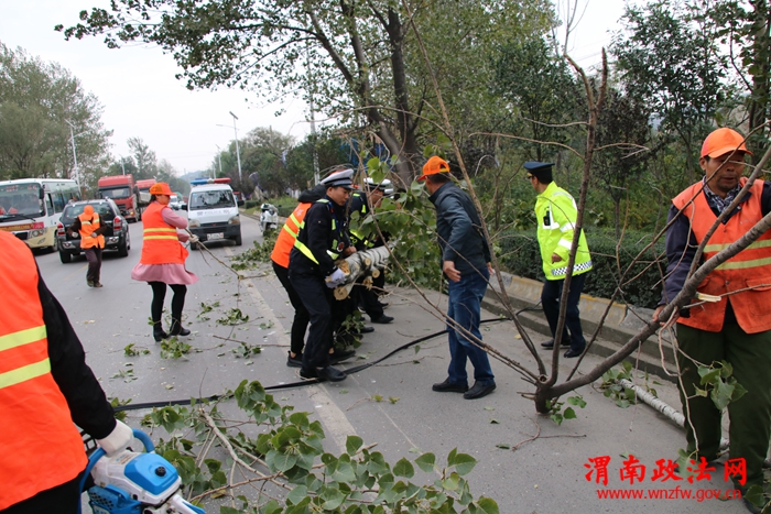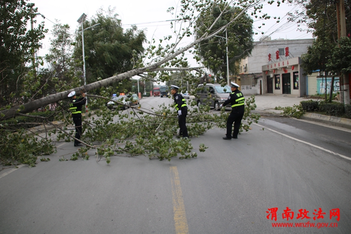 渭南政法网(通讯员 张峰)10月15日上午,持续的大风天气将310国道上的大树刮倒,交通受阻,正巧被正在进行路面巡逻的华阴交警发现,民警立即行动,疏导交通、排除险情,使受阻的交通迅速恢复通行。