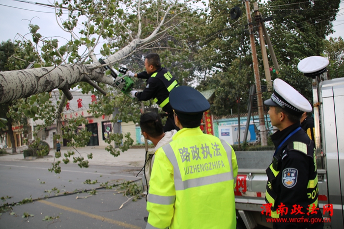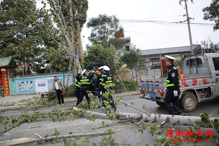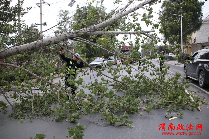 深秋气候多变,阴雨狂风恶劣天气增多。为积极应对恶劣天气,华阴交警大队各执勤中队加强路面巡逻管控,全力保障辖区道路安全畅通。15日上午,当执勤民警巡逻至310国道华阴观北段时,发现一颗大树被狂风刮倒,树枝压断电线,横倒路面,造成交通拥堵。险情就是命令,民警快速封锁现场,对该路段实行临时交通管制,同时联系中队值班领导请求增派警力增援。