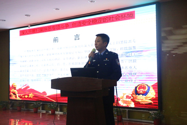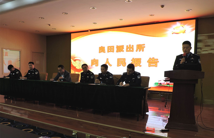 副所长郗鹏向参会代表报告了2019年良田派出所在扫黑除恶专项斗争、社会治安防控体系建设、“枫桥式公安派出所”创建、服务群众等方面工作开展情况。同时分析了辖区社会治安状况、就各类安全防范提出针对性的改善措施,希望群众积极配合派出所开展各项工作。会上,良田派出所还组织全体代表观看了“扫黑除恶专项斗争”专题片,民警王小康通过ppt讲解的方式向代表们具体而形象的展示了扫黑除恶专项斗争开展以来我所所取得打击成效和打击力度。民警王斌从日常的接处警及典型案例入手用通俗易懂的语言向与会代表们讲解了如何识别和预防电信网络诈骗。