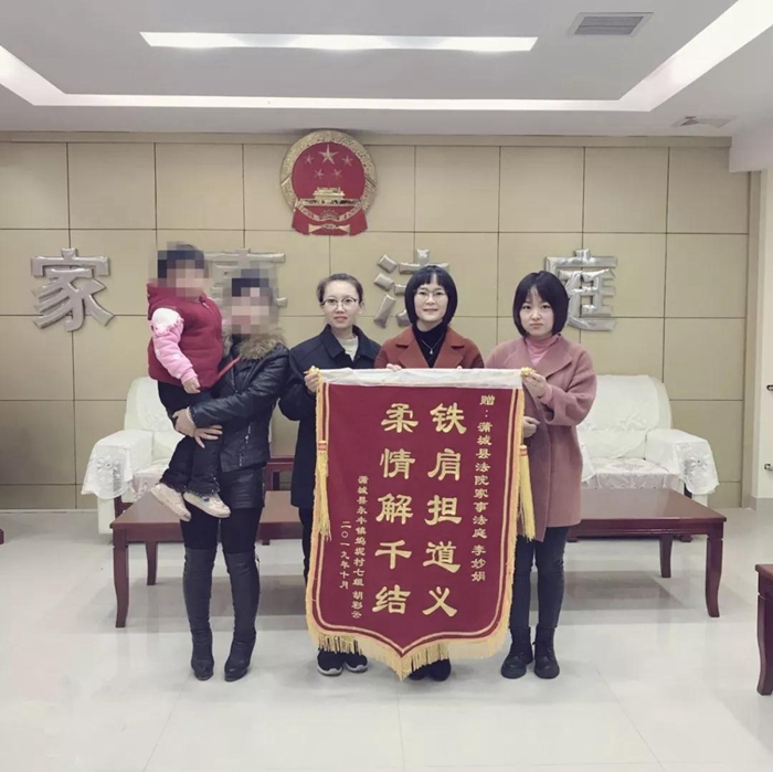 近日,一起监护权纠纷案件的当事人柴云将一面书写着“铁肩担道义 柔情解千结”的锦旗送到蒲城法院家事审判庭李妙娟庭长手中。