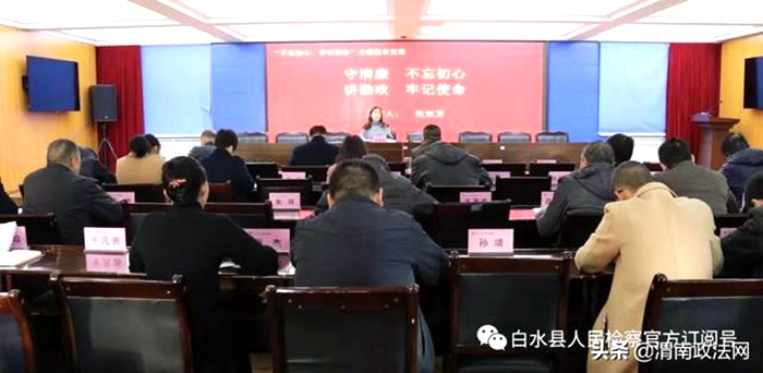 【在“不忘初心、牢记使命”中守清廉、讲勤政】在“不忘初心、牢记使命”主题教育深入开展中,11月19日,白水县人民检察院党组成员、县纪委监委派驻检察院纪检组组长张旭芳以“守清廉 不忘初心;讲政治 牢记使命”为题为全体党员干警讲授了一堂廉政建设专题党课。