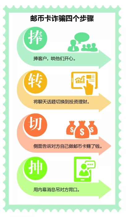 最后一步就是“抻”了,主要是针对有投资意向的客户,在聊天时会择机发些邮币卡的走势图给对方,让客户知道第三方一直在盈利,原因是有关系,可以知道内幕消息。这样一来有意向的客户肯定会要求和第三方一起做邮币卡。这时就“抻”,告诉他第三方的关系不是谁都能利用的,进而吊客户胃口,让他感觉到第三方关系的真实性,进而坚定客户跟着第三方做邮币卡的信心。