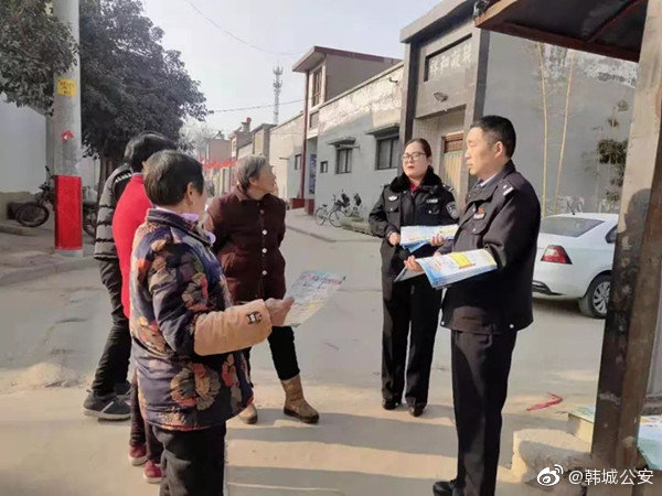【“百警进千家访万户”防范电信网络新型违法犯罪宣传活动】作为打击防范电信网络新型犯罪的主力军,近日,韩城公安刑侦大队在“百警进千家访万户”宣传活动中坚持全警出击,在包联小区挨家挨户发放反电信网络诈骗宣传单、现场讲解、传授相应的防范办法,并与社区物业对接,形成警民联合宣传力量,在人流密集场所放置宣传画册,粘贴宣传海报,依托群众力量共同宣传,确保宣传到每一家、每个人。同时,积极推广关注“终结诈骗”微信公众号工作,使群众及时了解各类防范诈骗知识,免遭不法侵害。