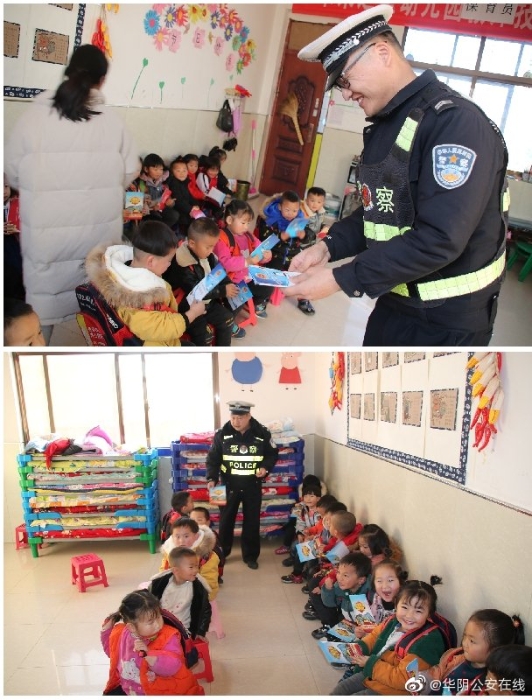 【“红灯停,绿灯行,黄灯亮了等一等”】近日, 华阴公安交警深入幼儿园,开展以“交安宣传进校园、安全知识伴成长”为主题的教育活动,为小朋友们上了一堂生动的交通安全知识课。民警介绍了交通安全标识、标志的作用,教会小朋友朗朗上口的交安知识小口诀,并发放印有交安知识的作业本,孩子们欢呼雀跃,活动现场气氛热烈。