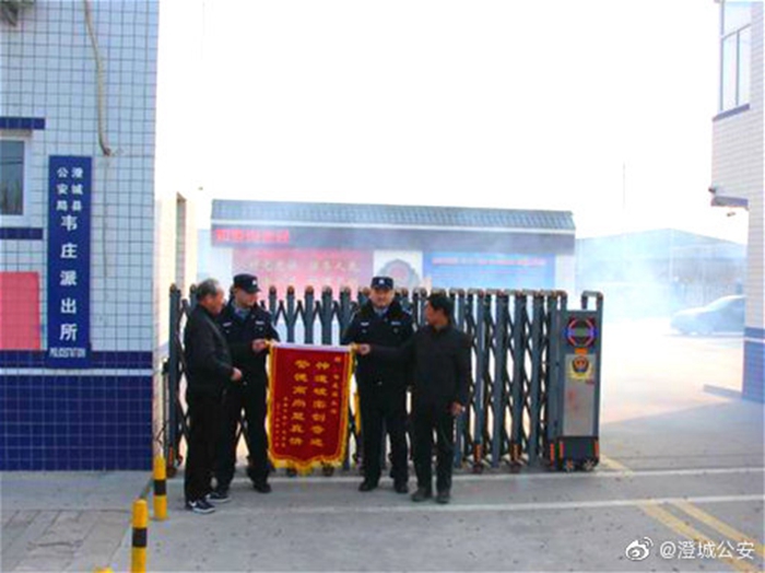 【神速破案创奇迹 警德高尚显真情】12月24日一大早,澄城公安韦庄所门口热闹非凡,原来是在韦庄街道经营商店的刘先生,将一面写有“神速破案创奇迹 警德高尚显真情”的锦旗送到民警的手中,以此感谢民警用短短一天时间,成功将偷窃他店中财物的犯罪嫌疑人抓获,并追回他店中被盗赃物。