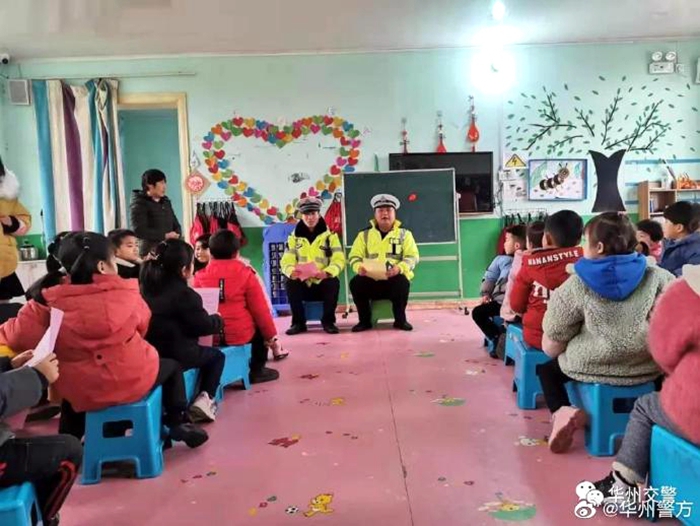【华州交警走进幼儿园上好“寒假前一课”】 寒假临近,1月8日,华州交警柳枝中队民警走进幼儿园,给萌宝们送去了一堂生动有趣的交通安全宣传课。活动中,民警通过浅显易懂的语言讲解行走斑马线、过十字路口遵守交通信号灯等交通安全常识,并实时与孩子们进行互动,在快乐的氛围中让平安种子深入心田。