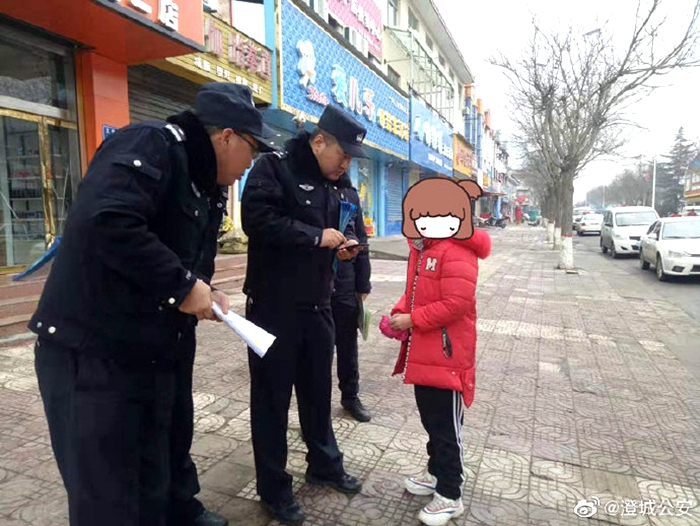 【出门在外 请照看好孩子】1月10日,澄城公安韦庄派出所民警巡逻时,发现一个小女孩惊慌失措、独自走在街道上,出于直觉,民警判断小女孩走失了,立即上前询问,得知女孩在与爷爷逛超市时走散,民警耐心的安抚,并根据女孩提供的电话联系上了家属。警方提醒:出门在外一定要照看好孩子,谨防走失。