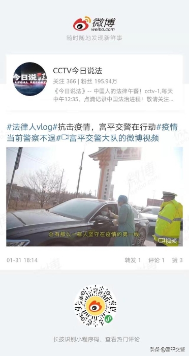主动发声,指导推进防疫工作。在抗击疫情的关键时期,针对公路干线沿线各村封路工作进行排查指导,主动宣传国务院关于防控疫情对公路交通管理的“一断三不断”的原则,希望辖区各村、特别是主干公路沿线各村封路时切实认真遵守,实现防疫与应急工作的“双赢”。针对农村防疫的薄弱环节,大队法宣中队通过“富平县农村交通安全工作微信群”及时发布疫情交通管理信息,指导基层交通管理工作。为鼓舞士气,由法宣中队牵头,拍摄了全面体现富平警民抗击疫情的宣传片“疫情面前,总有那么一群永不退缩的人”,被网友纷纷转发点赞,甚至受到CCTV法制频道、公安部交通管理局等国家级媒体转发采用,在全国范围内引起良好反响。