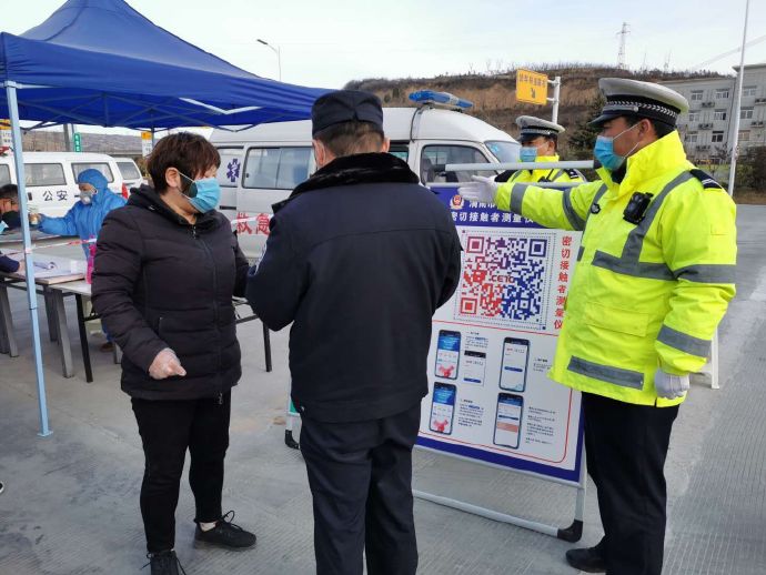 2月15日,在疫情威胁面前塬区中队民警坚守在道路一线全力配合防疫等部门,逐个排查进入辖区的车辆和人员,并进行扫码登记和检查。