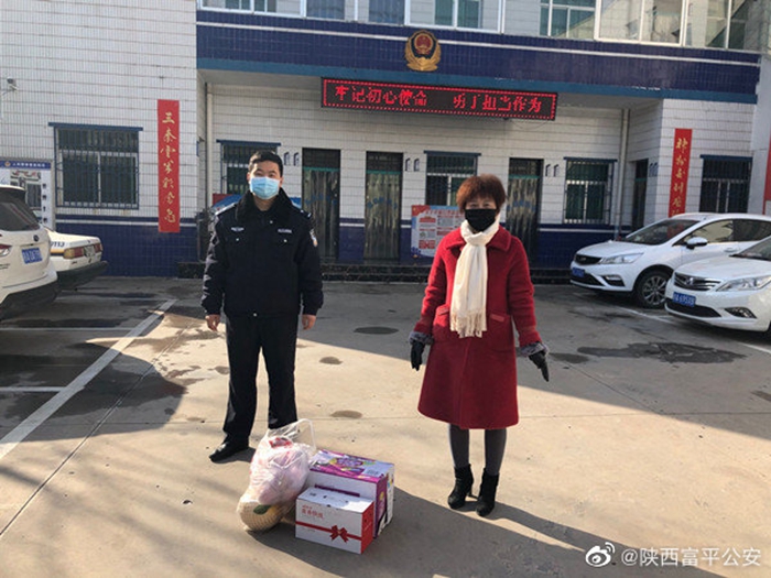 2月18日,富平县宫里镇五羊加油站负责人由红英来到富平公安宫里派出所,为战斗在抗疫一线的民辅警送来方便面、水果等慰问品。