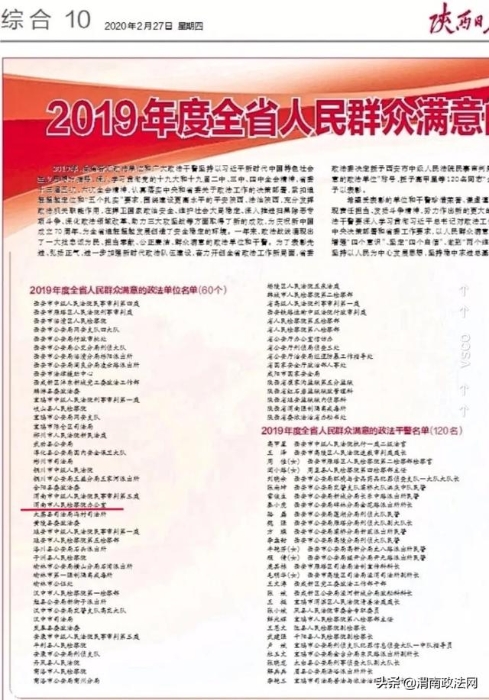 2019年,渭南市检察院办公室全体人员坚持以习近平新时代中国特色社会主义思想为指导,紧紧围绕党组决策部署,充分发挥参谋助手、综合协调、督促检查、政务保障职能,各项工作取得新成效,被省委政法委授予2019年度全省人民群众满意的政法单位称号。