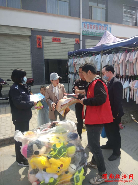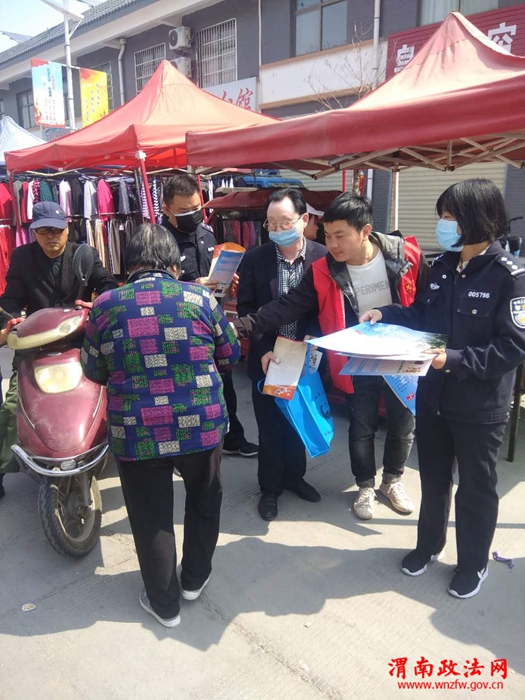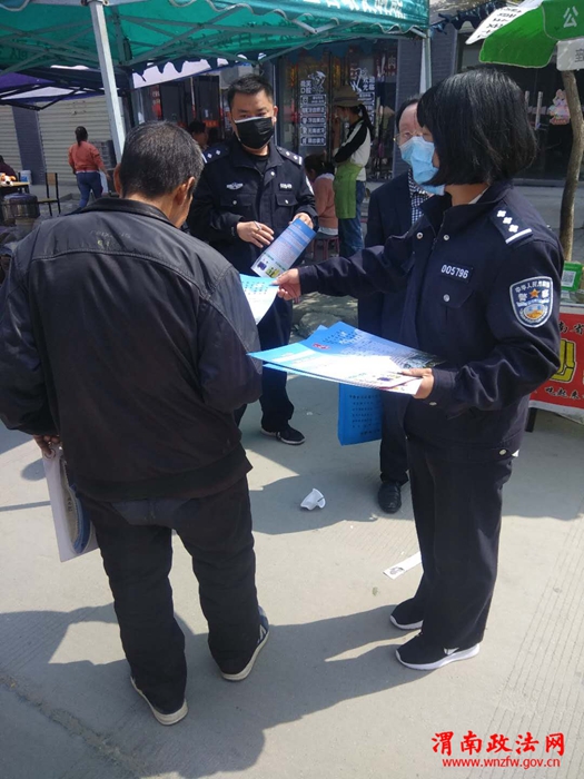 渭南政法网(通讯员 赵娜)一场疫情打乱了人们生活的节奏,按下了人们出行的“暂停键”。疫情缓解后,4月9日,华阴市孟塬镇迪家集市迎来了首个开放日,塬区的人们怀着喜悦的心情踊跃赶集,孟塬派出所利用集市人流量大这一有利时机联合孟塬镇综治办、司法所、车站社区开展平安建设集中宣传活动,对平安建设、扫黑除恶、禁毒和防范邪教、宪法等知识进行全方位宣传,让法律、法规知识走进群众,走进日常生活,增强群众法制意识。