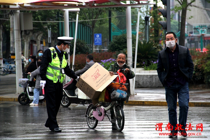 随着春暖花开,有序恢复复工复产复学,道路上车流人流明显增多,4月14日一大早下起小雨,陕西省渭南市公安局交警支队临渭大队"蒲杰爱民服务岗"民警全员上岗执勤,忙着指挥车辆通行、护送孩子上学、帮扶送货老人,忙完天已放晴。多年来他们人在路上,心在路上,忠诚坚守,无论晴雨,爱民事迹层出不穷,民警岳蒲杰被授予"中国好人"称号,群众亲切地称"他是渭南城下班最晚的交警"。