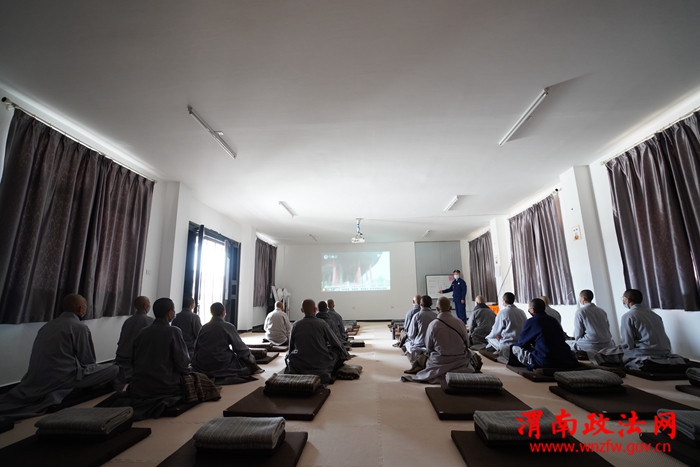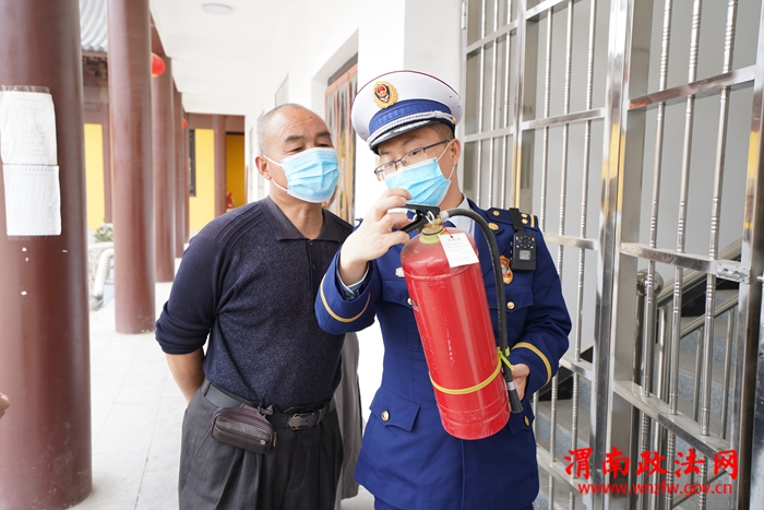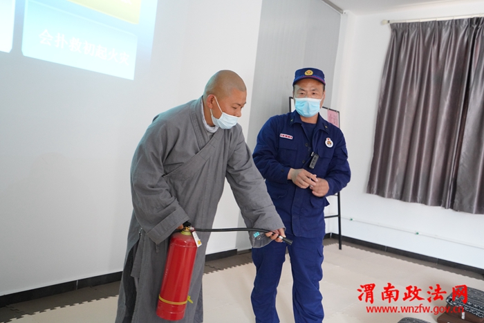 接下来,大队宣传人员组织寺院全体工作人员进行日常消防安全知识培训。通过近年来国内外文物古建筑典型火灾案例,结合寺院实际情况,详细讲解日常灭火器材如何正确使用和维护保养、如何排查预防火灾隐患、如何扑救初起火灾及组织人员疏散逃生等消防知识。