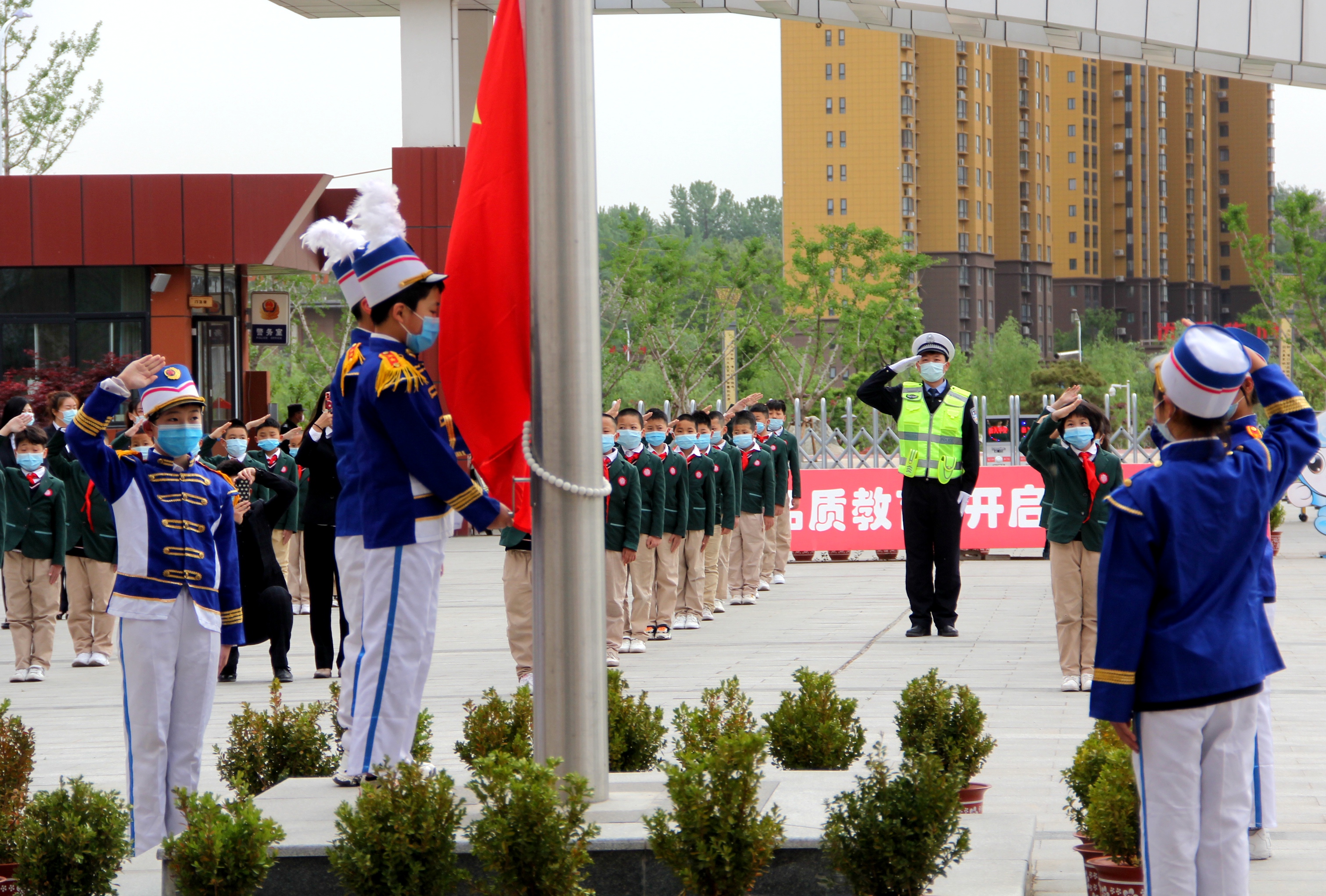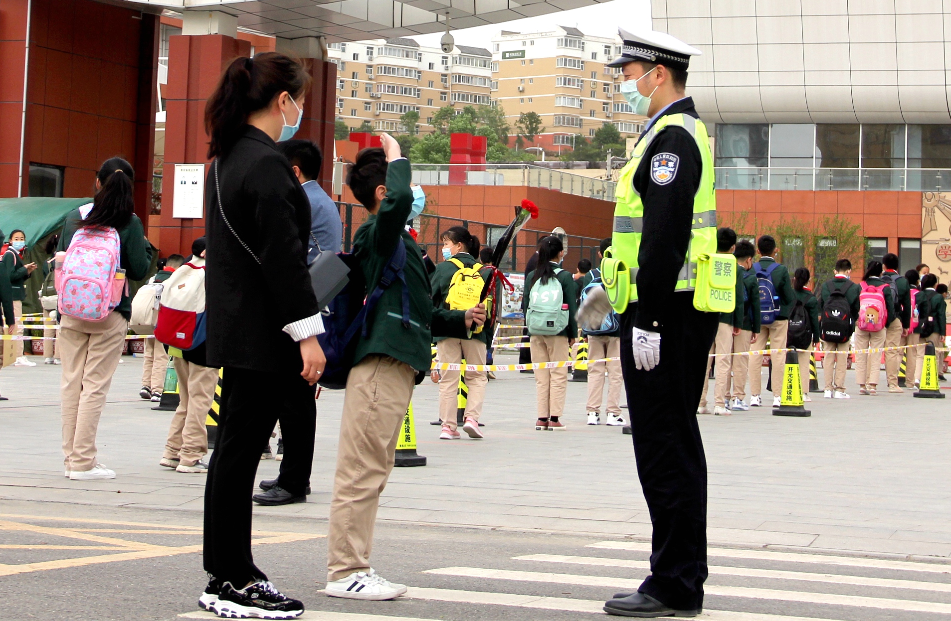 开学第一天,他们又看到了依然站在学校门口护送他们上下学的交警叔叔,还是那么认真,但更加显得亲切。为了感谢民警一直以来的辛苦付出,一位小学生和他的妈妈给护学民警送上了一枝鲜花和标准的少先队礼。随后民警也与学生们共同进行了开学第一天升国旗仪式。