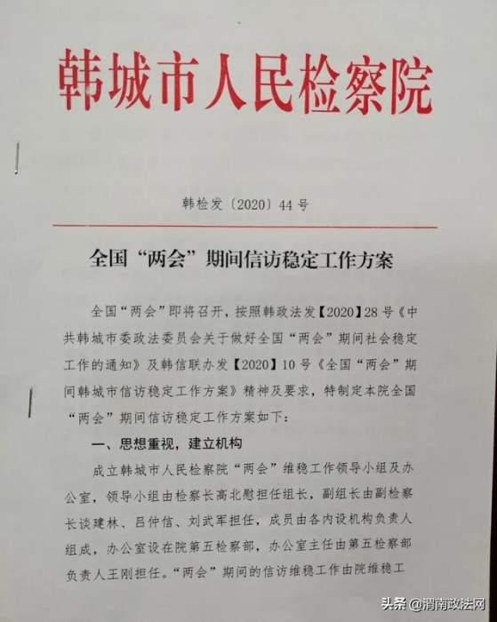 首先,思想重视,建立机构,制定了《韩城市人民检察院全国两会期间信访稳定工作方案》,成立了以检察长高北慰为组长的两会维稳工作领导小组及办公室,将维稳工作做为当前首要政治任务,制订维稳工作应急预案,切实加强了对维稳工作的组织领导。