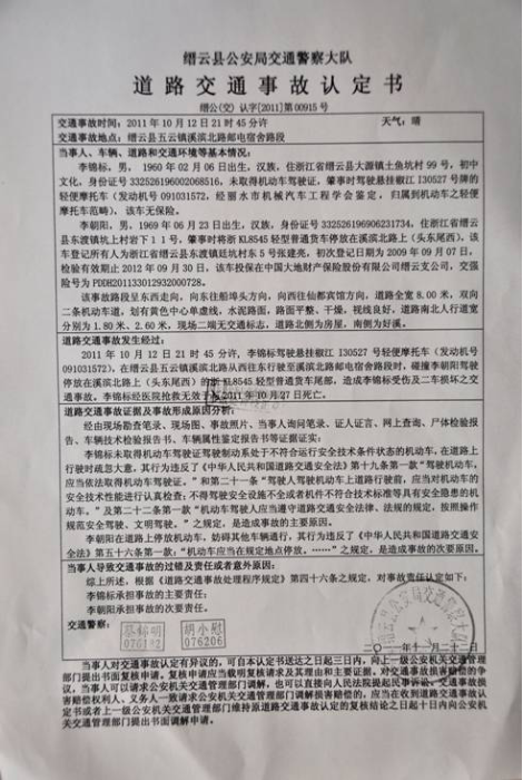 2011年10月12日晚,李锦标下班回家吃了晚饭,骑上摩托车外出活动。9点40分左右,他途经县城主街道溪滨北路时,不慎撞上了一辆临时停靠在路边的货车尾部,顿时头破血流,昏迷不醒。路人见状,立即报警,由120急救车直接送到缙云县人民医院抢救。后来,由于伤情太重,又转送到丽水市中心医院抢救治疗。