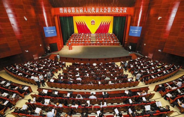 会场布置简朴,气氛庄严热烈。主席台帷幕正中的国徽在鲜艳的红旗映衬下熠熠生辉,对面悬挂的“以习近平新时代中国特色社会主义思想为指导,认真落实‘六稳’‘六保’工作任务,奋力谱写渭南新时代追赶超越新篇章”巨幅标语催人奋进。