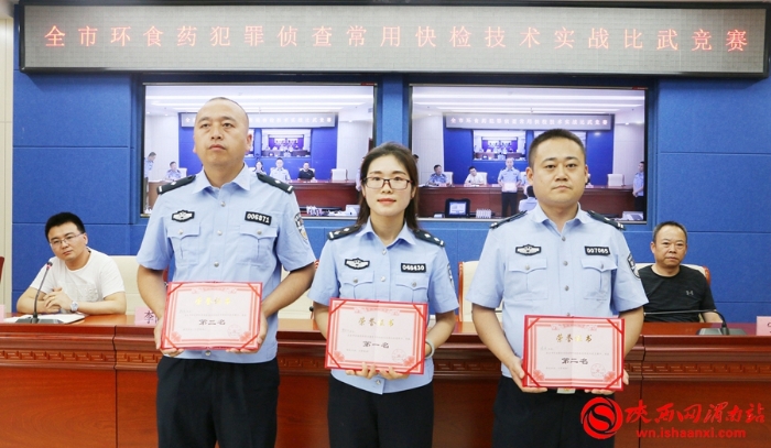为确保比武竞赛公平公正,当日,市公安局专门邀请了省公安厅环食药总队、渭南市市场监督管理局相关业务专家,以及专业研发制造快检设备公司的技术人员共同担任此次比武竞赛的评委。评委综合考量参赛选手在取样与称量、离心机使用、上清液的提取、检测液的加入、比色皿转移以及检测结果等方面的操作,现场打分评比。最终,经过3个多小时的激烈竞赛,合阳县公安局民警樊雪洁摘得桂冠;富平县公安局民警李恒和澄城县公安局民警梁小飞分获二、三名的好成绩。