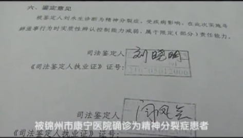 经锦州市康宁医院确诊,刘永生患的是精神分裂症。