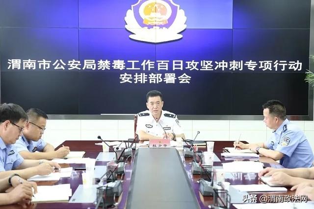 8月4日,渭南市禁毒委副主任兼禁毒办主任、市公安局副局长杜少平主持召开全市禁毒工作百日攻坚冲刺部署会议,传达学习习近平总书记关于禁毒工作的重要指示精神和省禁毒委相关会议要求,点评通报上半年禁毒工作,安排部署全市禁毒工作百日攻坚冲刺专项行动。各县(市、区)禁毒办主任、禁毒大队长,市局相关部门负责同志,市禁毒办有关负责同志参加会议。