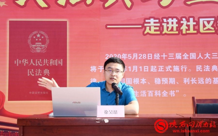 渭南市司法局副局长佛月升参加活动并讲话,临渭区司法局党组副书记文逸平主持。陕西赛高律师事务所徐昊喆律师讲授《民法典》的重要意义和立法特色。记者 马华莉摄
