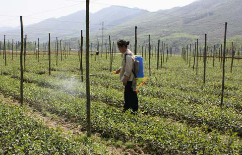 徐根生的妻子身体好转,在田间给花卉苗木喷洒农药