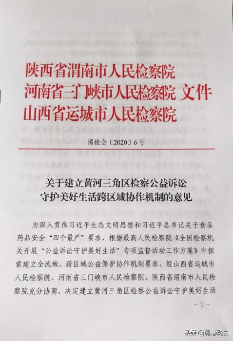近日,山西省运城市检察院、河南省三门峡市检察院、陕西省渭南市检察院共同出台了《关于建立黄河三角区检察公益诉讼守护美好生活跨区域协作机制的意见》,重点就做深做透区域内“4+1”法定领域,积极稳妥办理新领域案件,建立了7项工作机制。