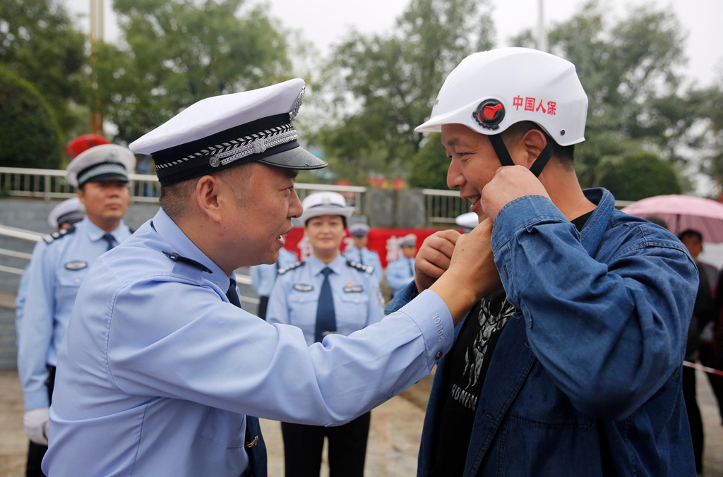 民警对参与群众发出倡议,倡导广大摩托车、电动车驾驶人从自我做起,按要求配备和使用头盔,养成安全出行的良好习惯,自觉文明遵守道路交通法规,开开心心出门,平平安安回家。