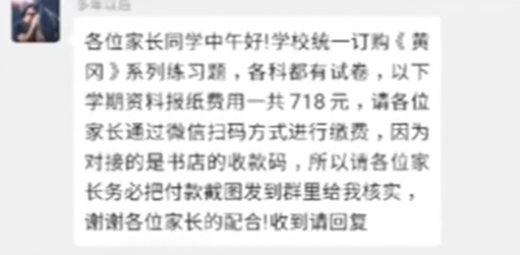 案发当天,他看到孩子的班主任雷老师在微信群里通知收取练习题费用共718元,并提供了收款二维码,他当即就扫描二维码进行支付。