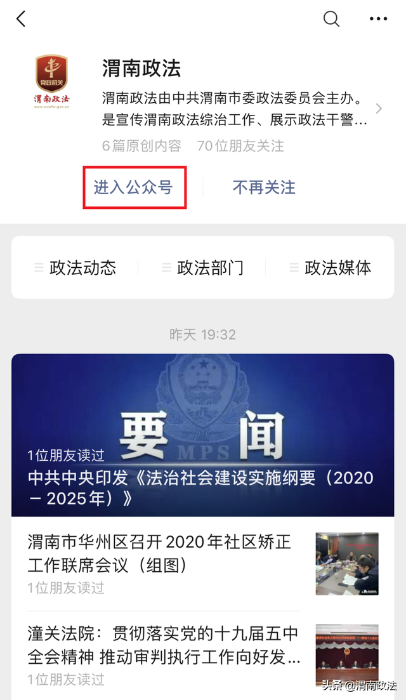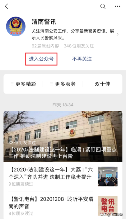 1.关注渭南市公安局官方微信公众号“渭南警讯”。
