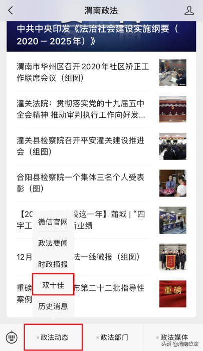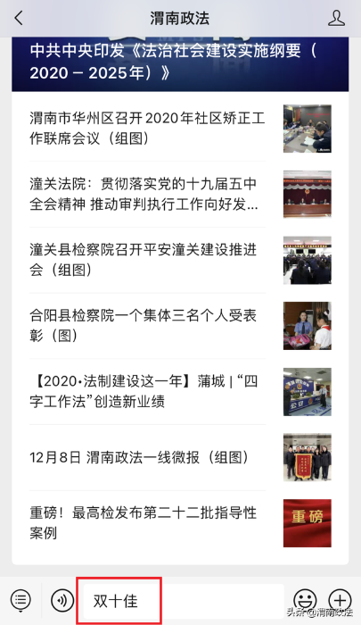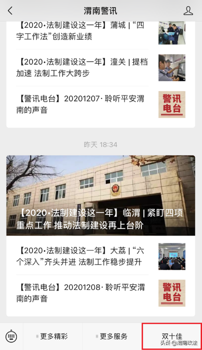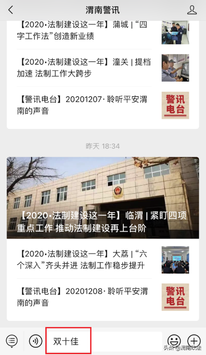 2. 进入“渭南警讯”或“渭南政法”微信公众号,输入“双十佳”,或在页面菜单栏点击“双十佳”,进入投票通道。