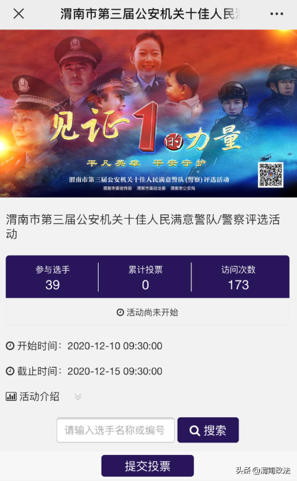 由渭南市委宣传部、市委政法委、市公安局联合举办的渭南市第三届公安机关“十佳人民满意警队”和“十佳人民满意警察”评选活动,经过各局申报、严格审核,共产生了20名候选民警和19个候选警队。