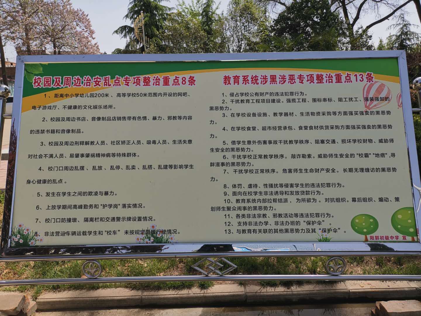 二、加强宣传,狠抓综合整治。先后组织扫黑除恶宣传教育3500余场次,发放宣传单35600余份,校园宣传覆盖率达到100%。在学校醒目位置张贴教育系统13类涉黑涉恶线索和8类治安乱点线索特征,公布举报电话和奖励办法,动员师生、家长和校园周边群众踊跃举报。联合公安、交通、市场监管、卫生健康、城管执法等部门,分工协作、定期摸排校园及周边乱点问题线索,发现乱停乱放、乱摆乱卖等问题,及时协同处置。会同公安交警部门做好上放学期间校门口的安全巡察和秩序维护,防止学生受到意外伤害。联合文化部门开展“扫黄打非”,积极推进绿书签进校园活动,对校园周边网吧、KTV、书店等场所进行专项检查,持续净化了校园环境。