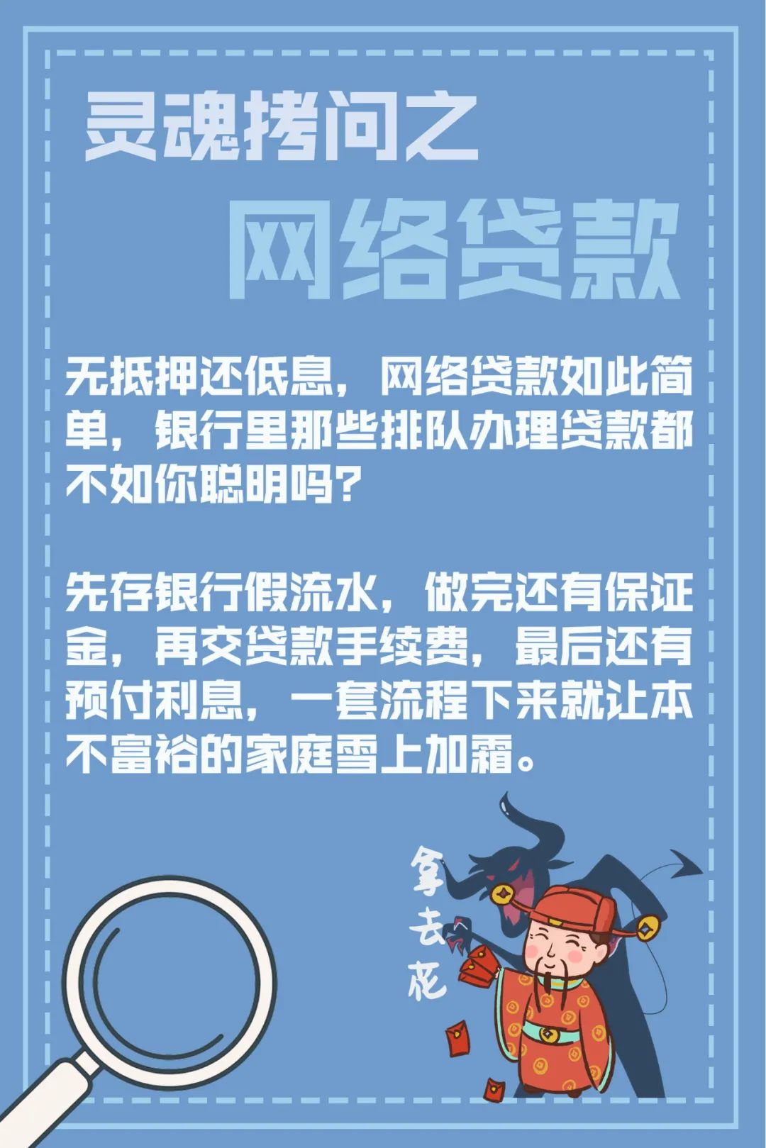 1.不要轻信陌生的来电、短信和来路不明的链接、广告,拒绝低息、无抵押诱惑。