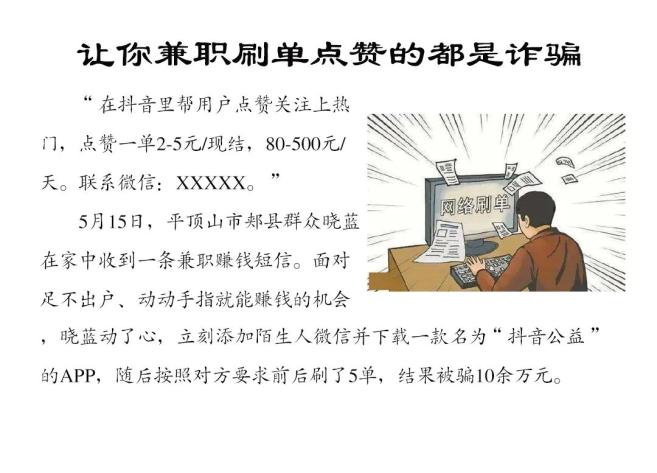 不要被“足不出户、几百进账”“动动手指、日进斗金”等迷惑性语言所蒙蔽,刷单本身就是违法行为,天上不会掉馅饼,不要被蝇头小利迷惑双眼,时刻谨记网络刷单都是诈骗。一旦被骗,请立即拨打96110报警。