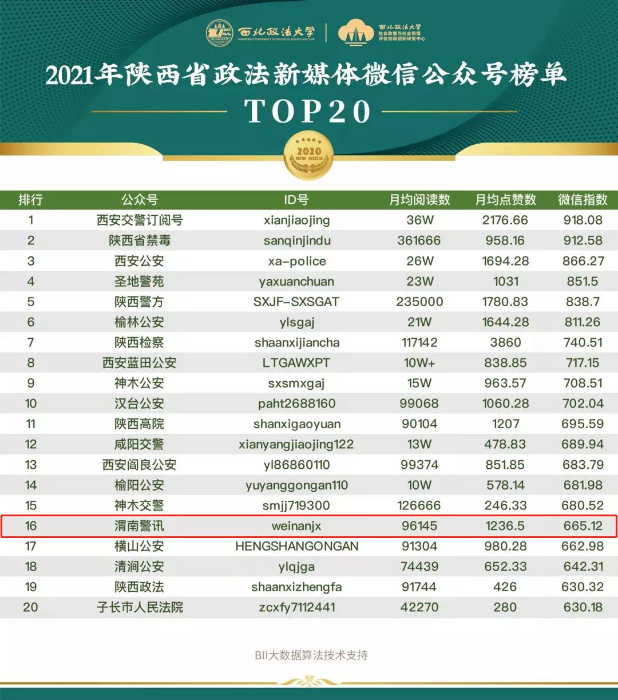 2021年陕西省政法新媒体微信公众号榜单TOP20