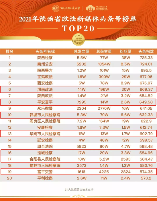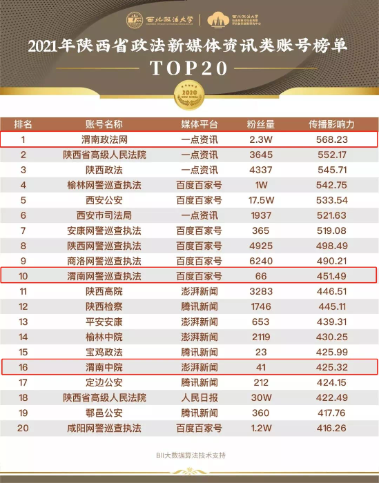 2021年陕西省政法新媒体资讯类榜单TOP20