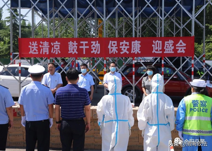 【合阳县委书记邓宽社、县长赵超慰问高温坚守一线交警】7月21日,合阳县委书记邓宽社、县长赵超深入路面一线开展夏季“送清凉 鼓干劲 保安康 迎盛会”慰问活动,为坚守高温一线保安全保畅通的执勤交警发放了防暑降温品,送去党委和政府的关怀,使全体交警备受鼓舞。县委常委、副县长王改,县委常委、宣传部部长李小鸽,县人大常委会副主任、工会主席刘春合,副县长、公安局党委书记、局长陈康,交警大队大队长雷振峰一同慰问。
