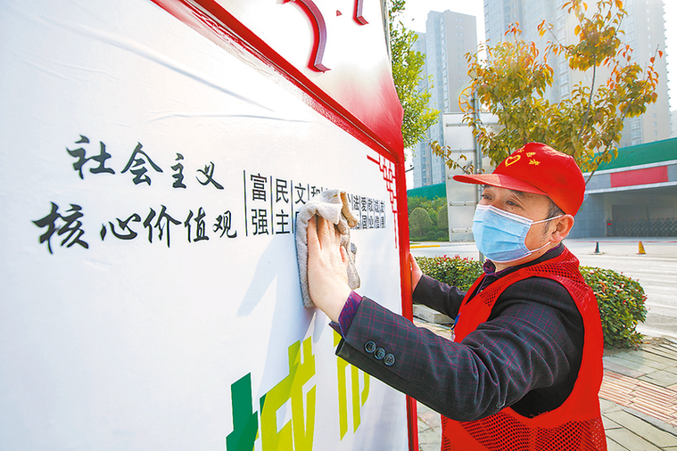 在华山大街,志愿者正在擦洗公益广告牌。记者马周宁摄