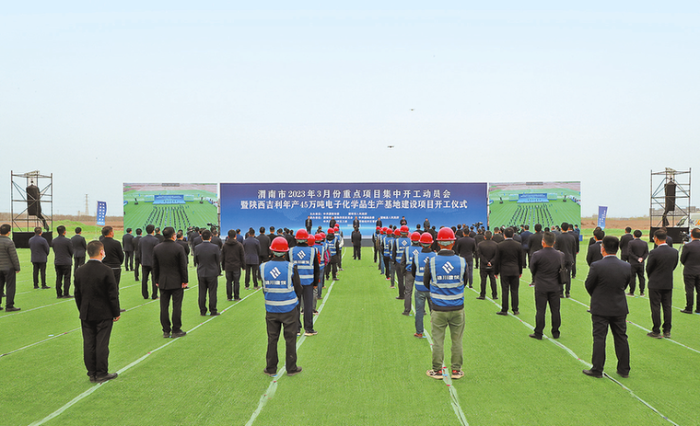 3月22日,渭南市2023年3月份重点项目集中开工动员会暨陕西吉利年产45万吨电子化学品生产基地建设项目开工仪式举行。图为蒲城县主会场。 记者 王晓宁 摄