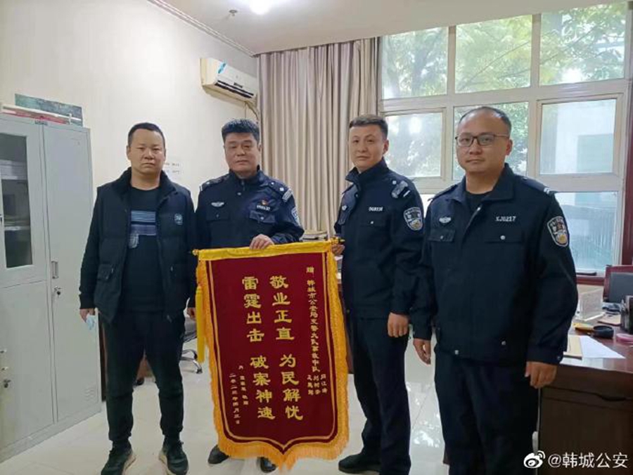 韩城公安交警火速破获肇事逃逸案,群众送锦旗致谢。