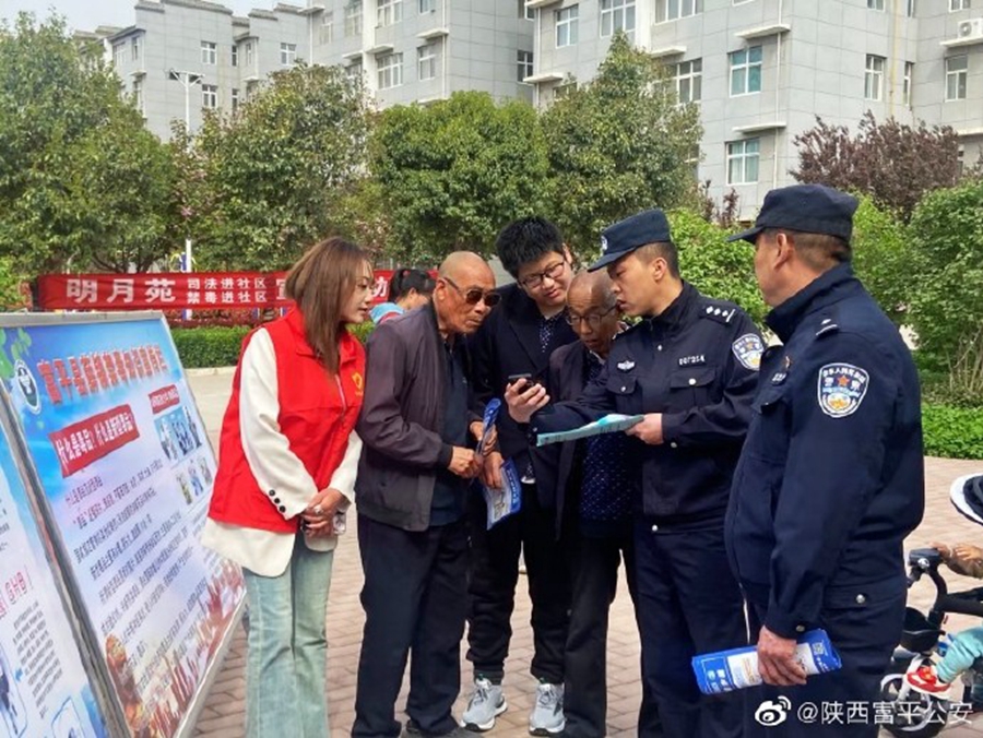 【富平公安:禁毒宣传进社区】4月12日,富平公安薛镇派出所联合司法所开展禁毒宣传进社区活动。民警向社区居民讲解了新型毒品种类、危害及预防涉毒违法犯罪的方式等内容,号召广大群众在自觉抵制毒品诱惑的同时,还要增强社会责任感,主动向身边的亲朋好友进行禁毒宣传,积极营造全民禁毒的宣传氛围。