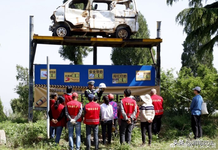 【现场普法 安全反思】 2023年4月30日全国交通安全反思日,陕西省渭南市公安局交警支队临渭大队民警组织辖区农村劝导员、村民群众和部分违法当事人,在临渭区渭桥路一处事故残骸车展台,开展交通安全反思活动。 活动现场,民警通过酒驾、不佩戴安全头盔、不系安全带、闯红灯、超速驾驶等交通违法行为,反思以往行路驾车的陋习,使村民群众认真审视并改正不文明的交通习惯,把宝贵生命从无情的车祸中解救出来,尊重人的生存价值和生存权利。