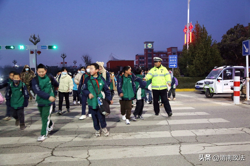 【潼关交警用心护学 为爱站岗】12月26日,在夜幕降临时刻,陕西省渭南市潼关县公安局交警大队城区中队民警在辖区校园周边道路指挥疏导交通,他们用心护学,为爱站岗,全力确保中小学生和接送学生家长冬季夜间出行安全。