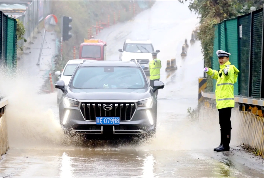 临渭交警在桥梁积水路段指挥车辆安全通行。
